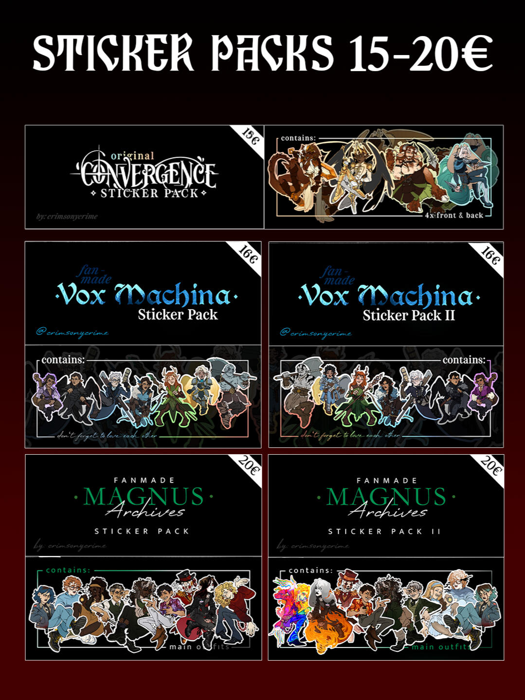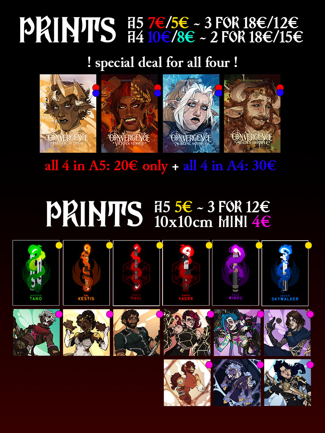 Welcome, welcome, welcome ~Welcome to Crimsonycrime‘s Con Catalogue, the place where you can find a list of all upcoming (and past) events AS WELL AS the complete and updated catalogue - aka what I‘ll bring to my next event(s)!